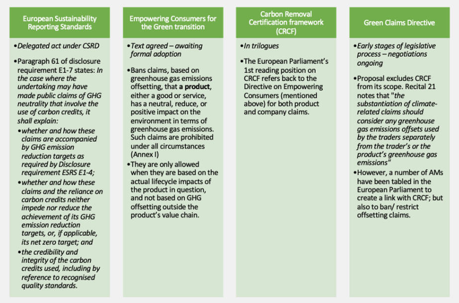 This aligns with the provisions set out in the European Sustainability Reporting Standards (ESRS) which requires companies to explain any green claims of GHG neutrality that involve carbon offsets, evidence the integrity of offsets used and prove that this does not impede the achievement of GHG emission reduction targets. Companies should explain whether and how these claims are accompanied by emission reduction targets.