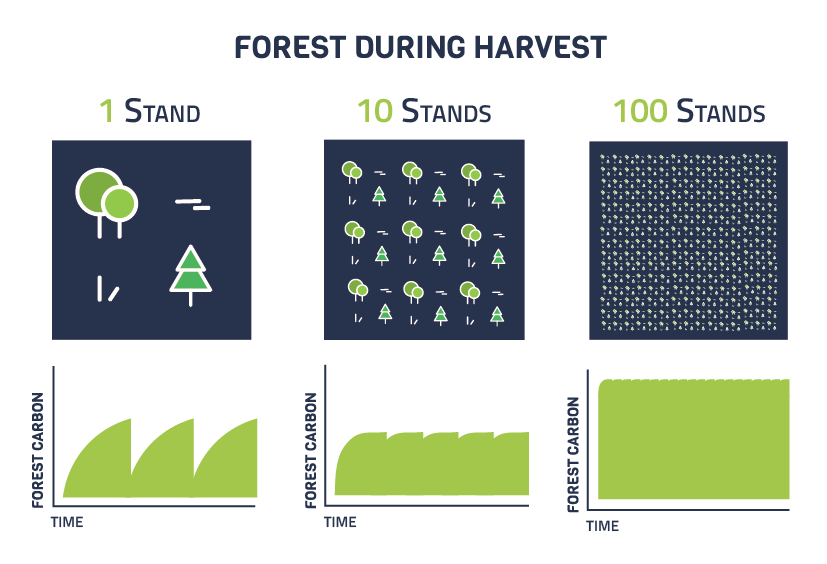 In the context of assessing the carbon balance of forest operations, one should keep a holistic approach. It’s extremely important to pay attention to the boundaries of the system. Indeed, what happens at stand level should not be extrapolated to the whole of the forest. As shown by the figure above, the carbon stored in the forest vary quite drastically when considering only a fraction of the forest (left), while the trends are much smoother at forest level (right).