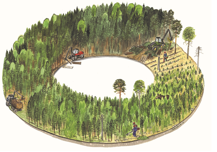 – Retention forestry, which leaves some trees or patches of trees standing after harvesting, either permanently or temporarily, thus creating deadwood and preserving old-growth elements that are valuable for many species, especially saproxylic ones.